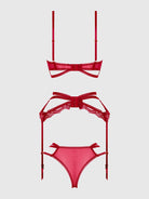 A flirty blend of sweet and sultry, the Bianca Strappy Lace Bra, Garter & Hipster Set is designed to turn heads. This three-piece lingerie look highlights your curves with open cup detailing, sheer lace panels, and a bold layered design that teases from every angle. Finished with a removable strappy garter, this set lets you switch from soft romance to full-on seduction in seconds.