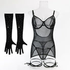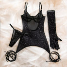 Turn heads and exude confidence in the Glamourous Lace-Up Black Mini Dress. This stunning sheer mini dress is designed to accentuate your curves with underwire support and adjustable straps, ensuring a perfect fit. Rhinestones sparkle throughout the dress, adding an extra layer of glamour and shine. Sexy lace-up detailing runs down the legs, enhancing your silhouette and adding a daring touch. The ensemble is completed with matching long-sleeve sheer gloves, adorned with rhinestones for a cohesive, captivating look. Perfect for a night of luxury, this dress is a must-have for those who want to stand out and feel empowered.