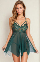 This mesh, handkerchief babydoll lingerie dress features a strappy lace bust, and thong.