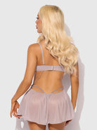The Presley Babydoll Set is designed to dazzle with every step. Made from airy shimmer mesh, it features sultry side cutouts, a demi cup bra with underwire lift, and glittering rhinestone chains that drape like jewelry across your curves. Paired with a barely-there g-string, this set is the definition of soft seduction—with a glitzy twist.