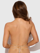 Product Details: - Plunge neck bra with all-over rhinestone design. - Figure-flattering drape construction. - Adjustable straps for a flexible fit.