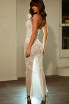 Our Floral Plunge Bodystocking Dress combines elegance and edge. Featuring a halter neckline with a deep plunge, a keyhole ring detail for a flattering fit, and an all-over floral design, this sheer dress falls to your ankles. The open-back and fishnet fabric add a daring touch, making this piece perfect for various occasions.