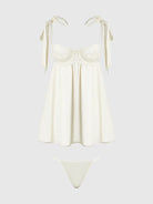 Celebrate your special night in the Rosalie Babydoll, designed for brides who want to captivate. This elegant empire-cut silhouette features a plunging neckline, crafted from luxurious stretch satin with delicate sheer lace cups. The adjustable shoulder ties add a touch of romance—simply release them and let the moment take over. Complete the look with the matching G-string. Perfect for the honeymoon and ever after.