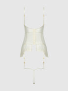 Bridal chemise redefined! This deep low-back design is sheerly stunning, perfect for unforgettable wedding nights. Experience allure with this micro-mini chemise featuring see-through wired cups and an open-back lace hem that beautifully showcases your curves. Satin bindings accentuate your waist for an hourglass silhouette, while the matching G-string adds the finishing touch. Adjust the straps for a perfect fit and pair with stockings for a dramatic flair!