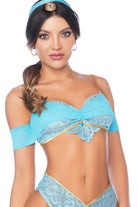This seductive and playful Arabian Night fantasy princess two-piece set features a top with adjustable straps, off-shoulder details, gold trims, and a matching lace bottom.