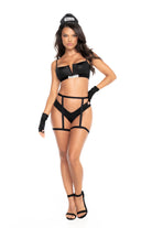 Sexy police costume. Includes top with V-separator neckline and adjustable straps, matching thong in a wet look fabric, elastic garter, gloves and head piece.