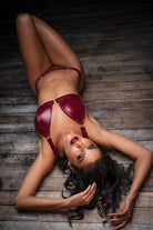 Two-piece vinyl set in an iconic color. Includes bralette with ring details and matching thong.