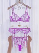 Discover allure in lavender with our sheer lingerie, adorned in love-themed embroidery. Seductive and elegant, each stitch whispers tales of passion. Elevate intimacy with our purple pieces, where transparency meets romantic design. Embrace confidence in our artfully crafted undergarments—a celebration of desire and elegance. 💜✨