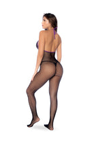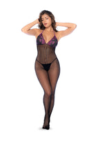 Show off your curves in this stylish fishnet bodystocking with lace cups, contrast trim details, a halter neckline, and a low back.