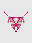 Showcase your assets like a goddess in this Nova G-string. Crafted in intricately embroidered lace with blacklight-ready embroidered lace. Exquisitely adorned with flirty tassels and a strand of pearls along the open-crotch. It’s delightfully erotic and playful. Want to turn up the heat? Wear this, and only this.