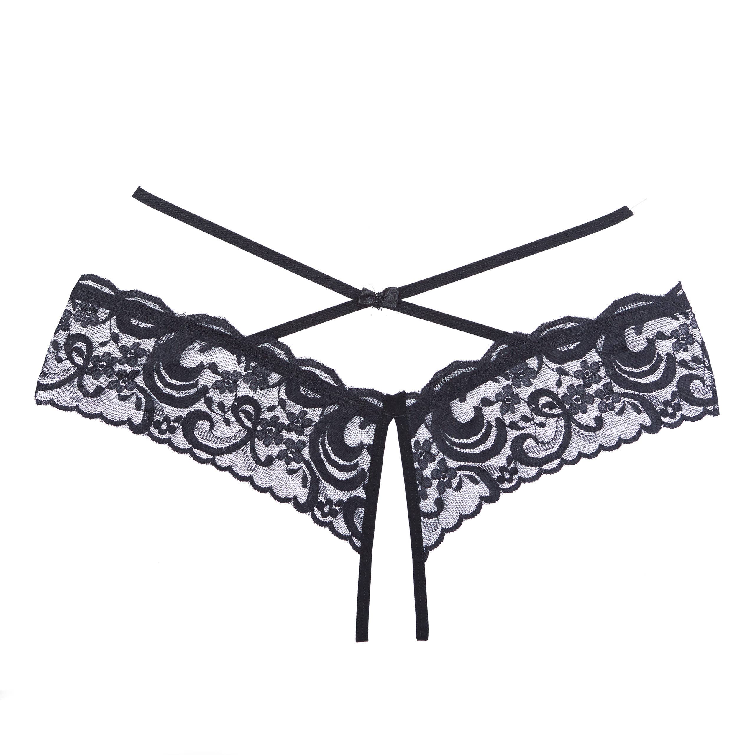 When you feel badass. This is your panty. Flirty straps wrap criss cross over the waist, scalloped lace accentuates a V-shape in the front & back. Crotchless.