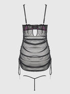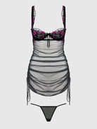 This chemise set is the epitome of seduction and elegance. Its square neckline, adorned with delicate scalloped edges, creates a regal aura, while the sheer, embroidered cups invite curiosity with every glance. The playful ribbon details add an enchanting touch, effortlessly blending whimsy and allure. The fine mesh shell, with adjustable side ties, offers a teasing glimpse of what's underneath, heightening the anticipation. When the ties are pulled, the silhouette becomes even more tantalizing, revealing the matching G-string for an enticing final reveal.