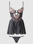Enchant and allure with the Nova Babydoll Set, featuring a sheer skirt that flows gracefully and a matching thong to complete the look. The underwire bra cup with a delicate lace overlay provides the perfect blend of support and sensuality.