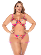 This enchanting babydoll is designed in colorful, embroidered sheer mesh, with delicate floral embroidery strategically placed to enhance and flatter your silhouette. Featuring underwire and adjustable straps and a matching G-string.