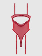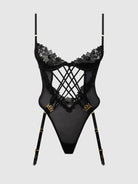 Embrace your allure in the Ashley Alexiss Teddy, crafted in stretch mesh and adorned with delicate fan lacing. Beautiful appliqué lace trims add a touch of romance, while wired cups offer the perfect support. This enchanting piece promises an unforgettable experience, celebrating your femininity and confidence. XOXO ASHLEY ALEXISS Product Details: -Luxe teddy features intricate fan lacings overlapping luxe lace appliques. -Appliqued cups are supported by underwire and adjustable shoulder straps. -The back features a cutout below the adjustable hook & eye closure and thong back. -Made of fine stretch mesh fabric -Features adjustable and removable garter straps.