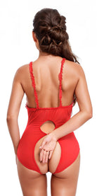 This all lace teddy features open cups, open back, ruffle trim, and mini bows.