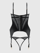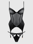 Vamp meets futuristic seduction with the Raquel Mesh & Silky Micro Bustier Set. Fine mesh and liquid satin mix to create a two-piece ensemble that sculpts. Sheer wired cups, silky panels, and a daring open-back panty that promises more than a peek make this duo a true taste of temptation. Product Details: - Set includes a bustier and matching panty. - Bustier in mesh and satin with wired cups and princess seams. - Matching strappy open-back hipster with front cutouts. - Adjustable straps and garter suspenders.