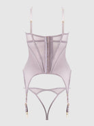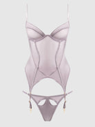 Vamp meets futuristic seduction with the Raquel Mesh & Silky Micro Bustier Set. Fine mesh and liquid satin mix to create a two-piece ensemble that sculpts. Sheer wired cups, silky panels, and a daring open-back panty that promises more than a peek make this duo a true taste of temptation. Product Details: - Set includes a bustier and matching panty. - Bustier in mesh and satin with wired cups and princess seams. - Matching strappy open-back hipster with front cutouts. - Adjustable straps and garter suspenders.