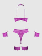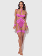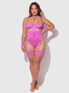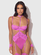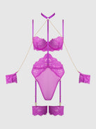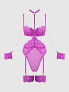 Reanna redefines bondage lingerie. This all-in-one monokini teddy has everything you need for a bold bedroom escapade. Crafted in richly detailed eyelash lace and mesh; and cut to flatter with a high-cut thong bottom that elongates your legs. To add to the thrill, this onesie includes a built-in choker and handcuffs linked with chains. Matching thigh garters complete the dramatic pairing.