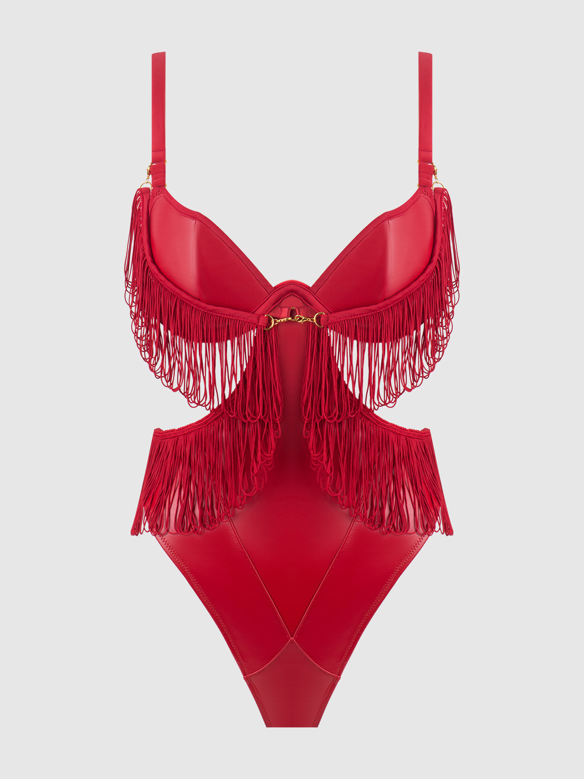 Phoenix Faux Leather & Fringe Crotchless Teddy Crimson Red