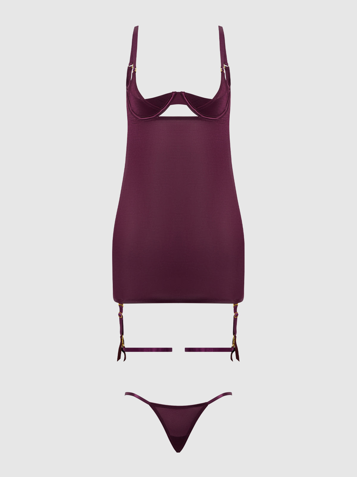Yasmine Shine Mesh O-Ring Thigh Garter Chemise Set Plum
