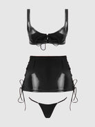 Get all slick and sexy with the Trinity Patent Lace Up Bralette, Skirt & G-String Set. This trio is made from high-gloss vinyl for a dominatrix vibe. Features a scoop neck bra with an adjustable lace-up front, a skirt with side lacing to tantalize, and a matching G-string. Perfect for nights when you want to bend reality and make your own rules.