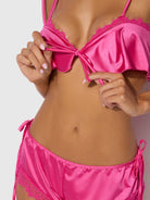 Soft seduction meets effortless charm in the Issadora Oilslick & Lace Drop Off Flounce Top & Panty Set. Designed to invite romance and playful allure, this flirty duo features luxe oilslick satin paired with delicate lace trim for a look that feels as good as it looks.