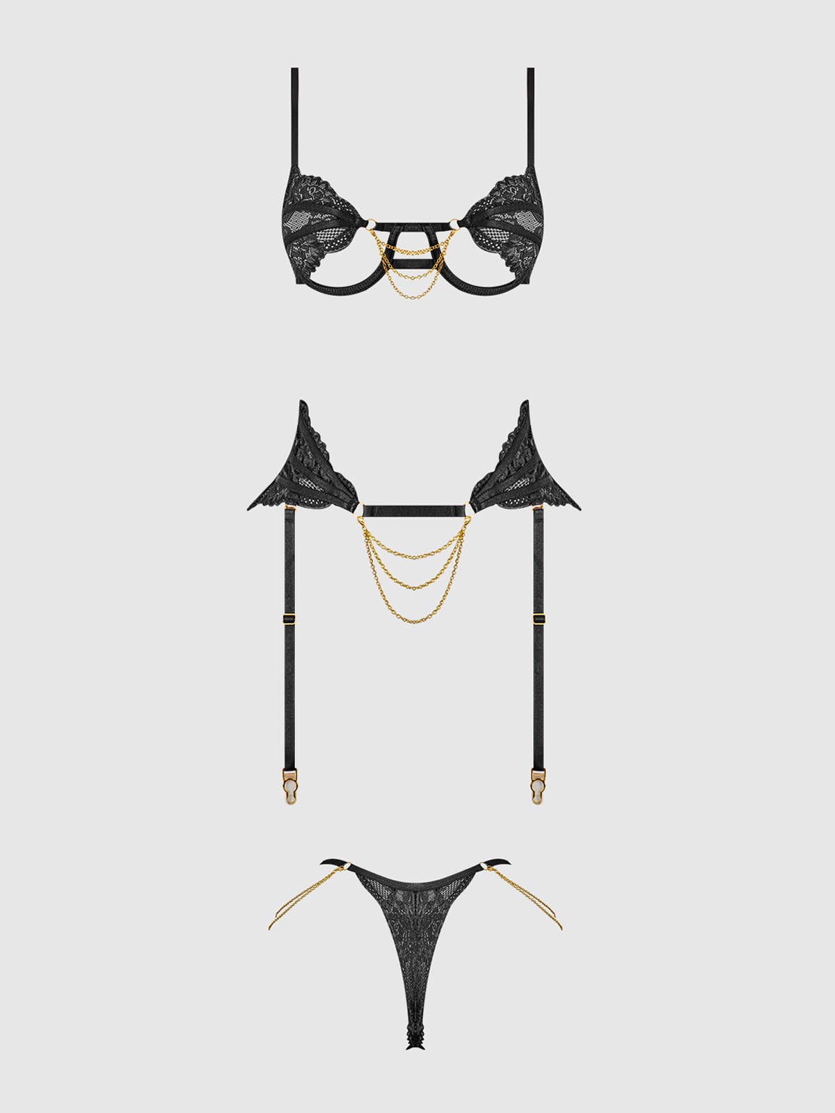 Dezi Lace & Chain Open Cup Bra, Garter & G-String Set