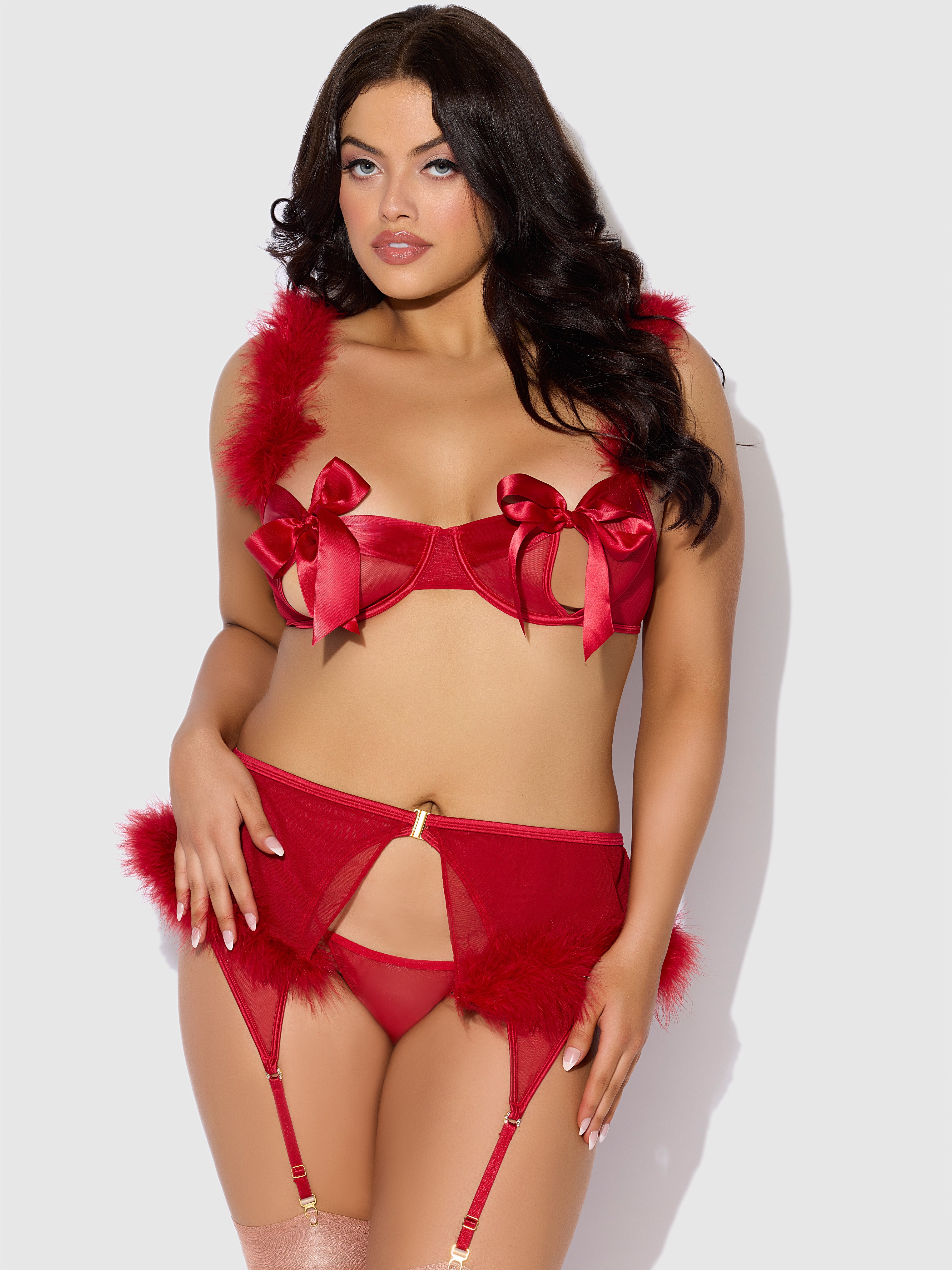 MARILYN MARABOU & MESH OPENABLE BRA, GARTER, & G-STRING SET
