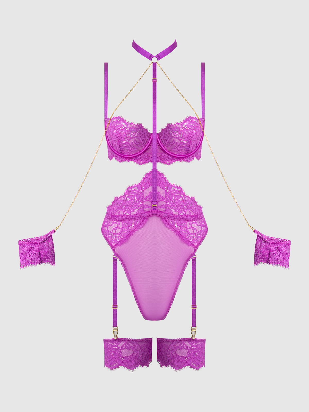 EVE LACE & CHAIN CROTCHLESS TEDDY WITH THIGH GARTERS