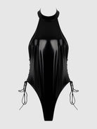Defy expectations and let temperatures rise as you enter the room in the Trinity Patent Lace Up Side Halter Bodysuit. This glossy vinyl teddy features a high halter neckline and a daring backless design. Adjustable lace-up sides ensure a perfect fit, while the high-cut thong silhouette will make your legs go on for miles. Perfect for nights when you're ready to break all the rules.