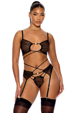 Pull My Strings Mesh Bra and Garter Belt Lingerie Set - Black