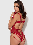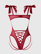 The daring strappy lace-up back invites playful exploration, adding an element of surprise to your intimate moments. Adjustable hip garters further contribute to the enchantment, allowing you to customize the fit to perfection.